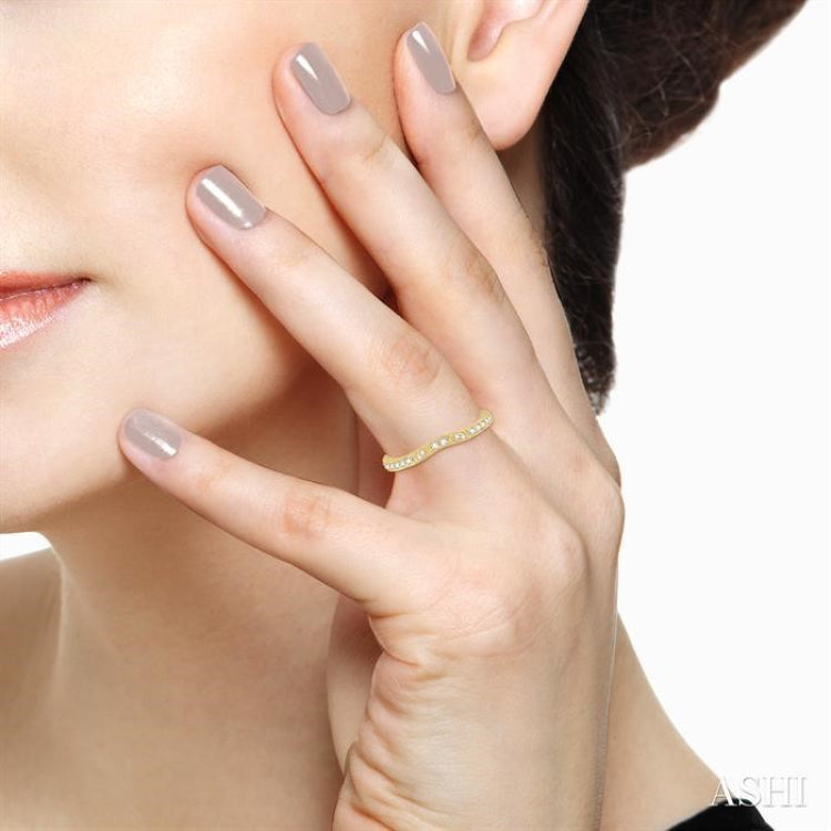 This delicately styled and minimally designed Wedding Band is a charming accompaniment to your wedding celebrations. It is embellished with 18 gleaming round cut diamonds in an artful prong setting. This ring is made in 14 karat yellow Gold with milgrain finish. Total diamond weight is 1/6 Ctw.