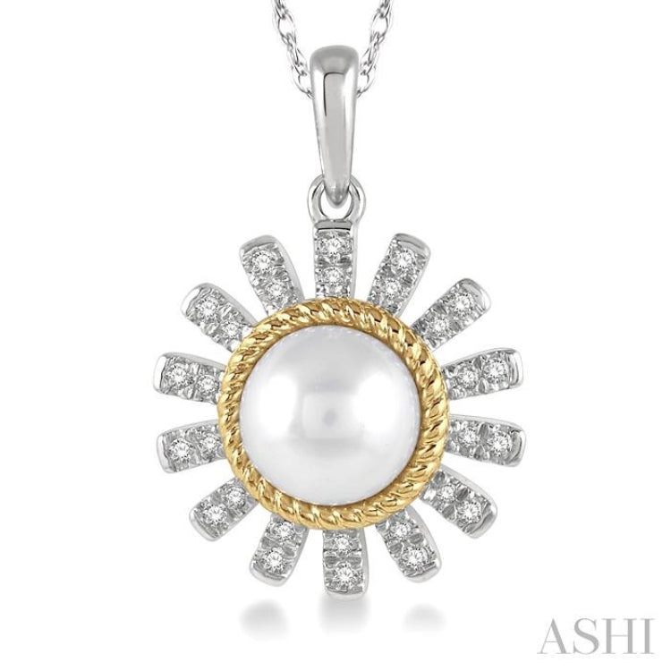 7x7 MM Round Shape Cultured Pearl and 1/8 Ctw Sunflower Round Cut Diamond Pendant With Chain in 10K White and Yellow Gold